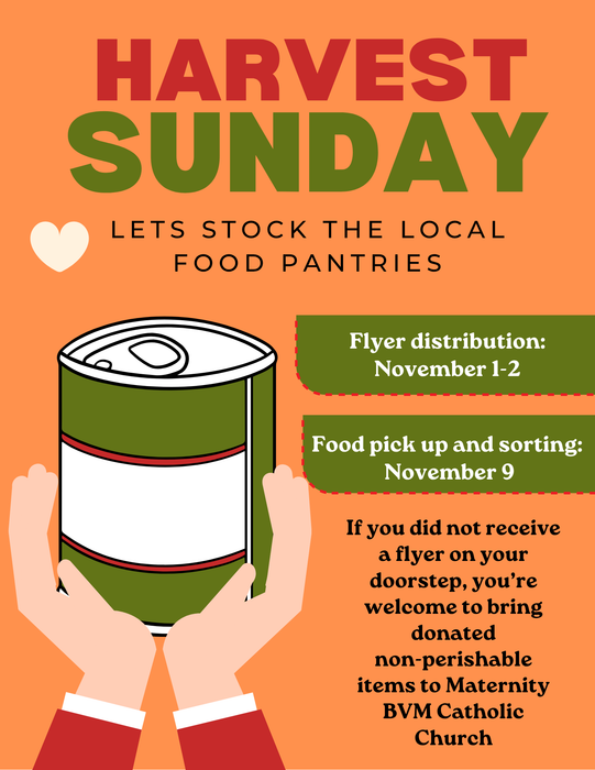 Our annual Harvest Sunday Collection, the largest food drive in our community, will take place on Sunday, November 9. Youth volunteers will be collecting non-perishable food donations right from your porch beginning at 9:00 a.m.