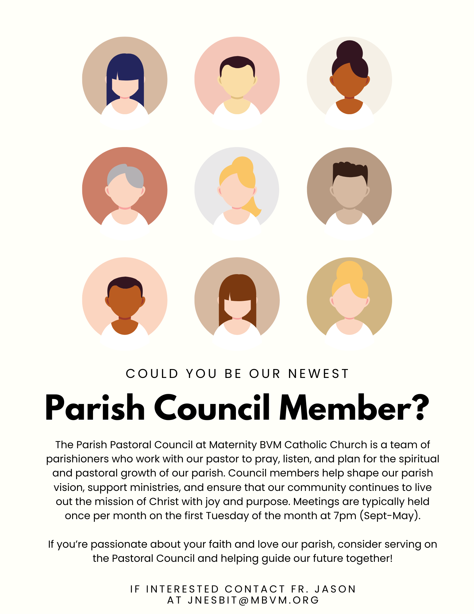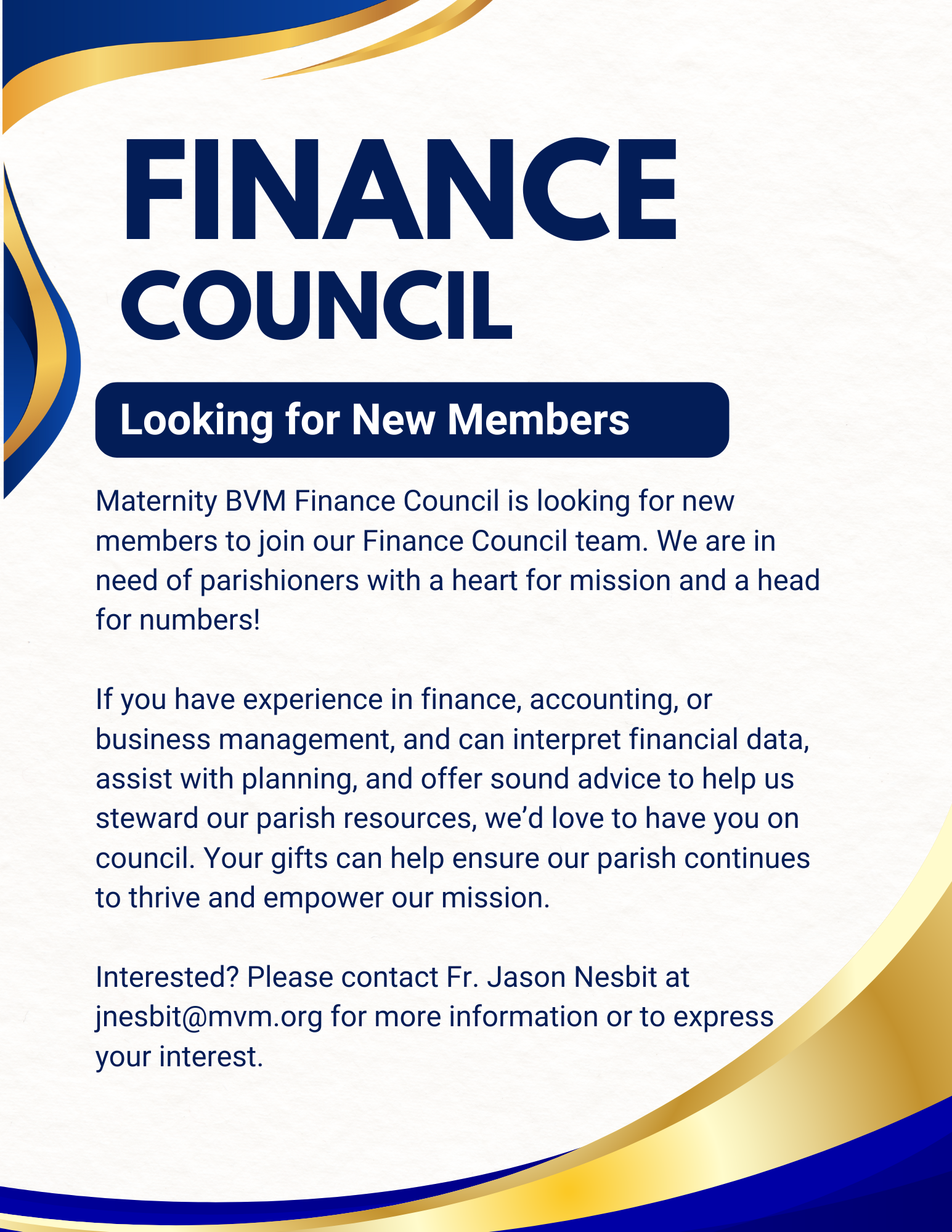 Our Parish Council and Finance Council play vital roles in guiding the life and mission of our parish. The Parish Council meets monthly on the first Tuesday to discuss parish activities, community needs, and ways to support our faith community. The Finance Council meets every other month on Thursdays to oversee financial planning, budgeting, and stewardship to ensure the parish’s resources are used wisely. Interested parishioners are encouraged to contact Father Jason to learn more and get involved.