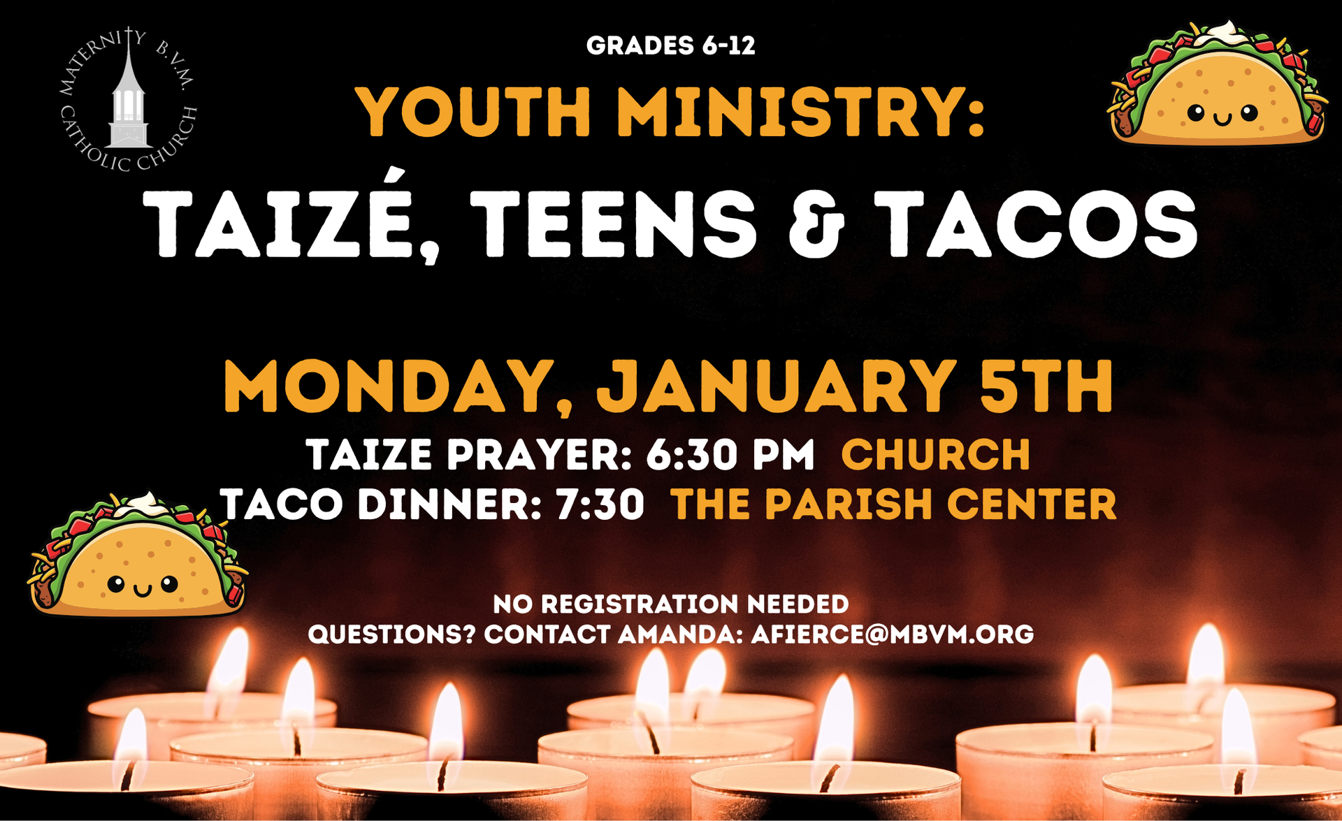- Jan 5: Teens, Taize & Tacos; 6:30-8:30 (church, parish center)