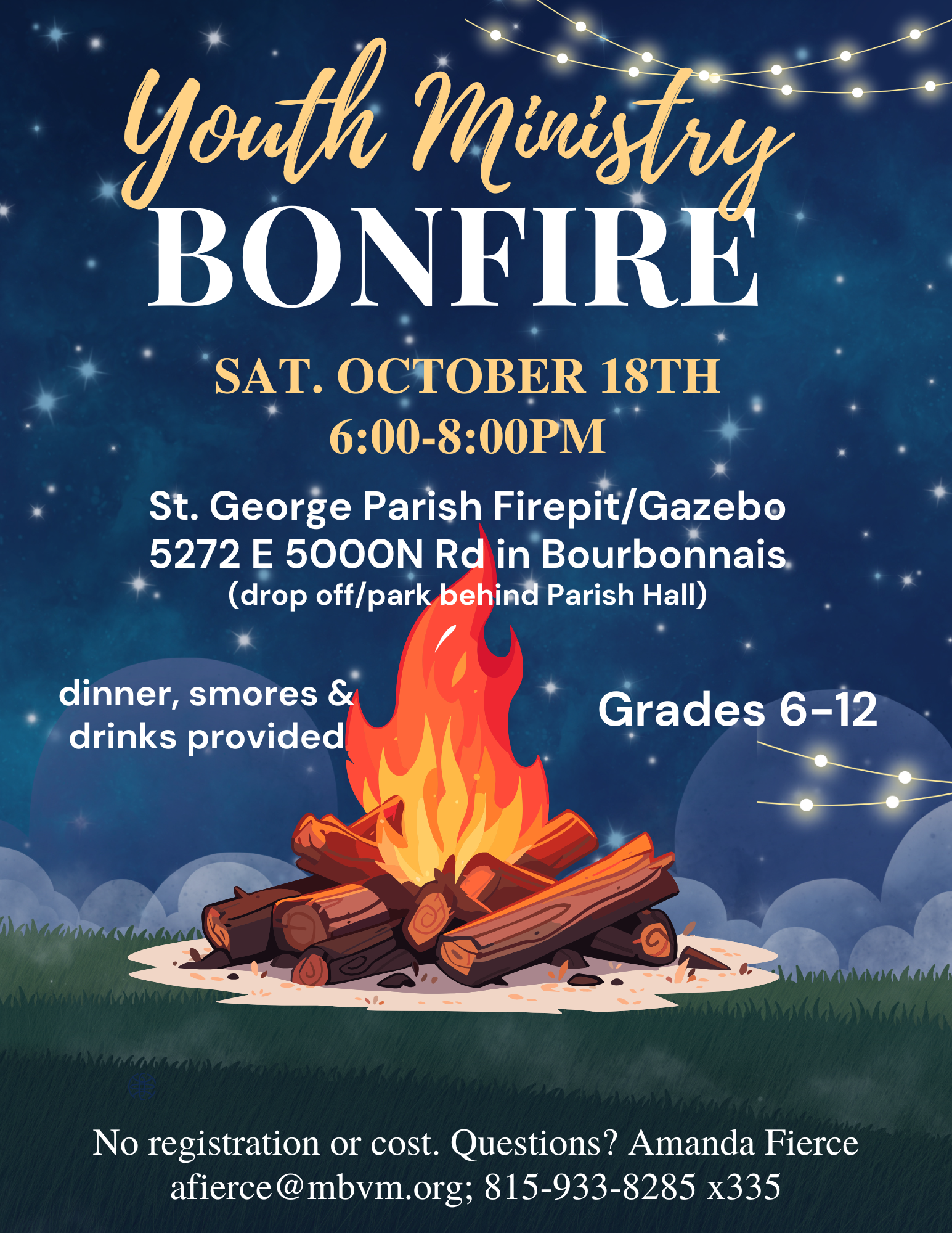 - Oct 18: bonfire, dinner & S'mores at St. George Parish, 6-8PM